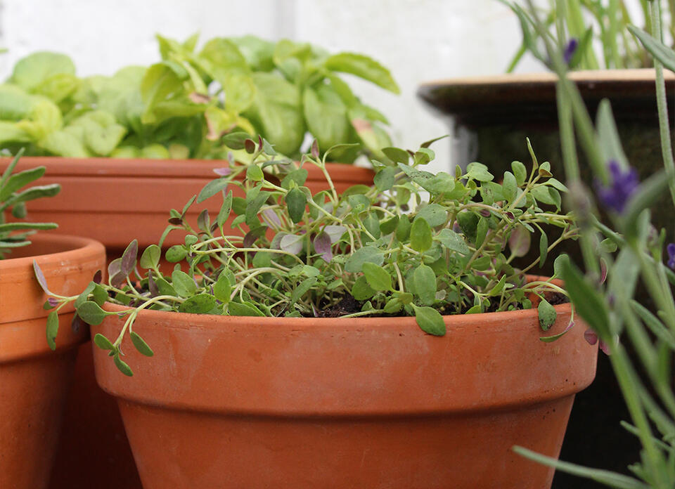 Les merI krydderbedet vokser timian, lavendel, oregano, mynte, sitronmelisse og mange andre krydder sammen med markjordbær og spiselige blomster som nelliker.