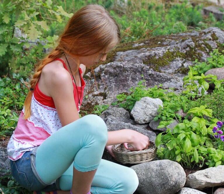 4. Plant ut de krydderne som krever mer nitrogen i den næringsrike jorden i steinpartiets fremkant, for eksempel basilikum, mynte og sitronmelisse. Øvrige krydder plasseres i steinpartiets mer veldrenerte jord. På baksiden av haugen passer det med for eksempel markjordbær, siden disse elsker veldrenert jord, men ikke trenger så mye jord.