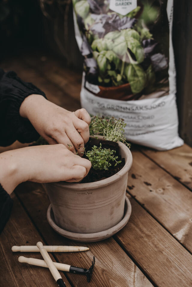 Takket være, at de fleste krydderurter trives i veldrenert jord, er de velegnet til å dyrkes i urtepotter. Velg gjerne en litt større urtepotte og kombinér krydderurter med spiselige blomster.