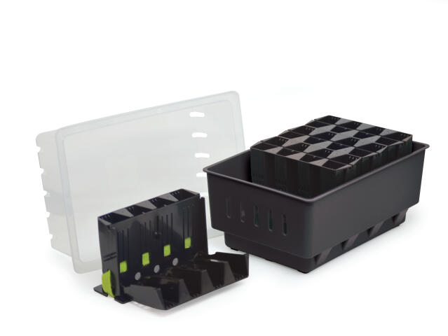 Et brett rommer 14 planter og i spirekassen med lokk er det plass til opptil tre brett. Det gjør det enkelt å ta ut ett brett om gangen for omplanting, samtidig som du lar de resterende brettene bli stående.