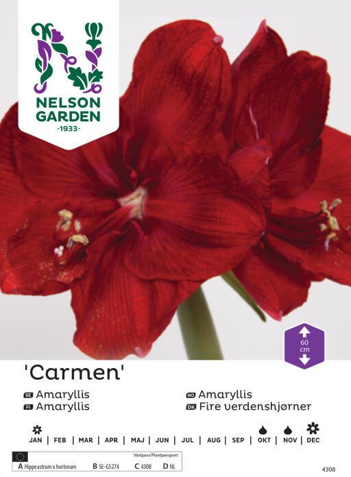 Mørkerød amaryllis med navn etter den vakre, flammende spanske damen. En julefavoritt med langvarige blomster. Flott og holdbar som snittblomst. Denne ekstra store og kraftige løken blomstrer på minst tre stengler, oftest på fire.