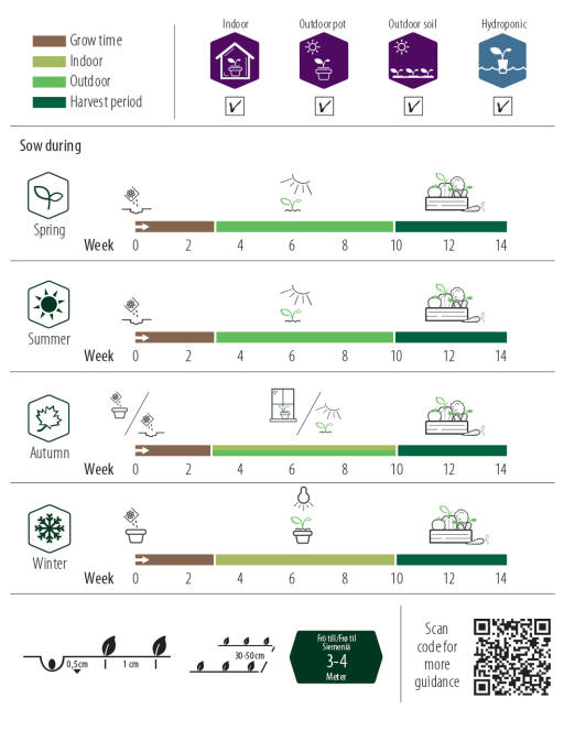 Mer detaljert informasjon om hvordan du sår, finnes her på produktsiden som du finner via QR-koden på posen.