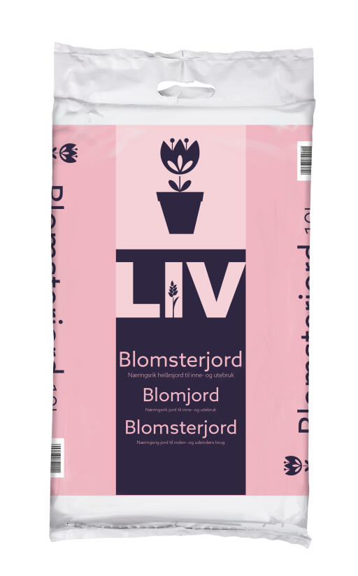 Liv Blomsterjord er en næringsrik jord som passer til blomster inne og ute – hele året. Bruk Liv Blomsterjord i potter, krukker og balkongkasser.