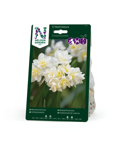 'Cheerfulness' er en bukettnarsiss, og som navnet antyder, sitter det to, iblant flere blomster på hver stengel. Blomstene er fylte, vakkert kremhvite med litt gult, og dufter herlig. Anses som mindre appetittlig for rådyr, hare, kanin og markmus.