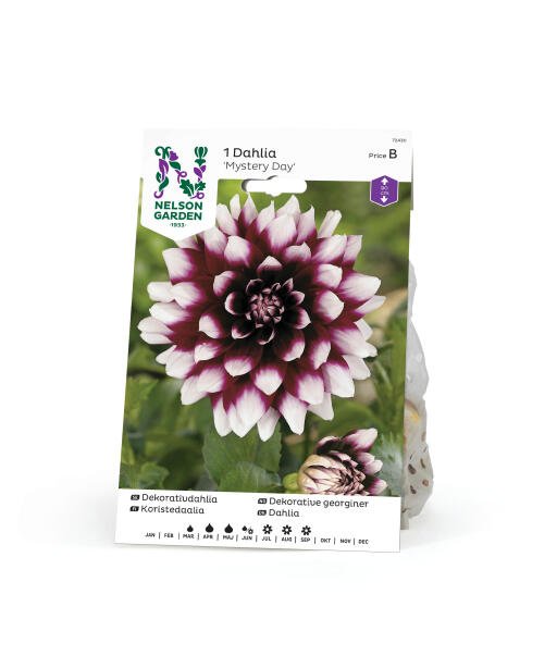 En praktfull høy georgine med spektakulære blomster i hvitt og lilla. En garantert fulltreffer i bed eller i en stor potte. Veldig fin som snitt.