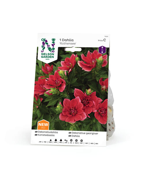 Fyldig, mørkerød dekorativ georgine av det litt nettere slaget. Blomstrer rikelig mot et matchende, mørkegrønt bladverk. Fin i bed og utmerket som snittblomst.