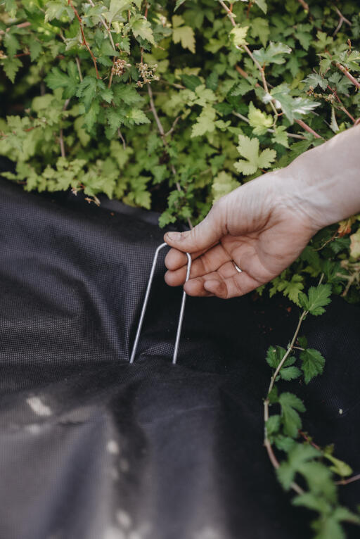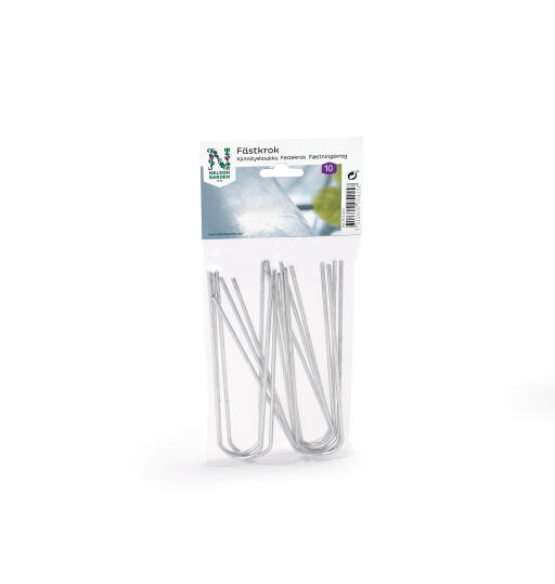 Festekrok for ulike typer duk og vev. Stikkes gjennom materialet og ned i jorden. Galvanisert metall.