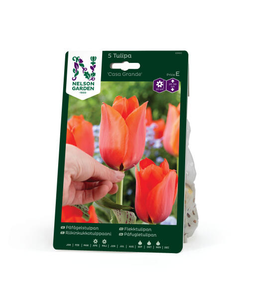 Tulipanen med den fantastiske store blomsten (opptil 20 cm), en oransjerød gigant på en stabil og kraftig stilk. Naturligvis en storslått snittblomst. Det bregnegrønne bladverket er også dekorativt med sitt kastanjefargede mønster.