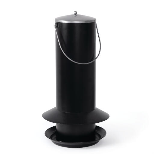 Romslig fuglemater for fuglefrø. Av pulverlakkert svart metall med skjerm som beskytter maten mot nedbør og større fugler. Bøyle for opphenging. Rommer 7 liter. H 48, Ø 20 cm.