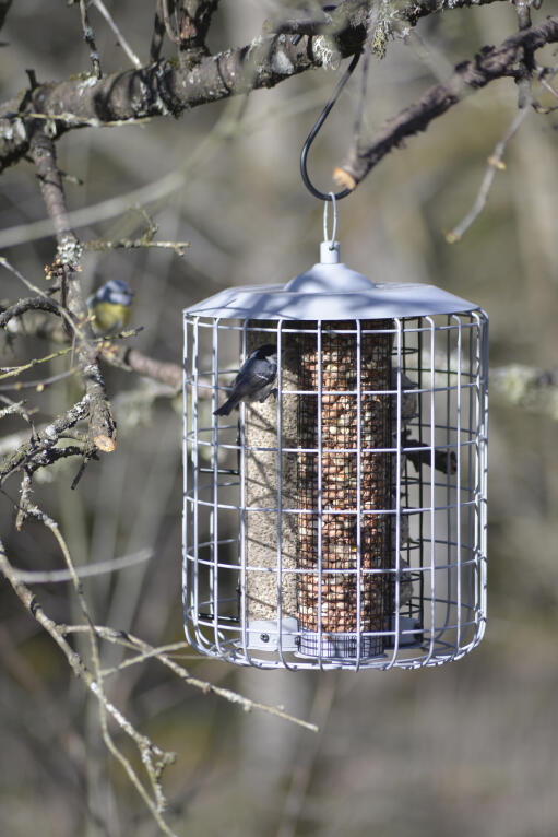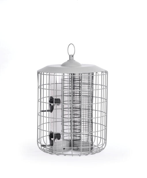 Stor fuglemater med beskyttelsesrist som stenger ute større fugler. Tre beholdere, en for fuglefrø, en for nøtter og en for meiseboller (90 g). Hver beholder rommer ca 1 liter (3 x 1 liter). Av plast og metall. Grå. H 34 cm Ø 24 cm