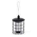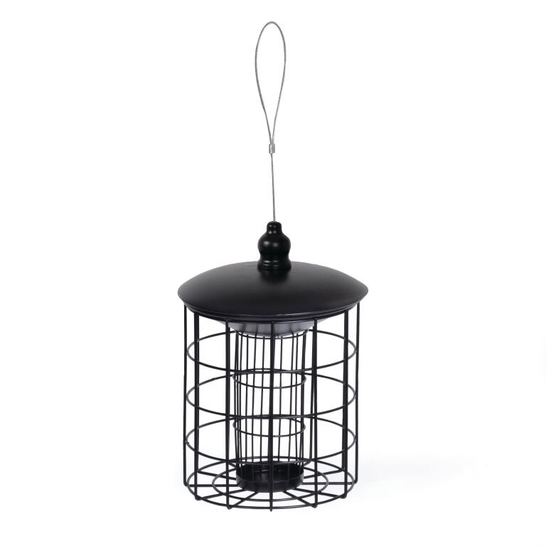 Fuglemater for meisebolle med beskyttelsesrist som stenger ute større fugler. Fylles på via lokket. Med vaier og karabinkrok. Svart metall H 29 cm, Ø 20 cm.