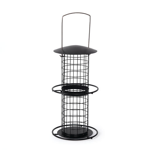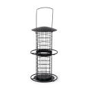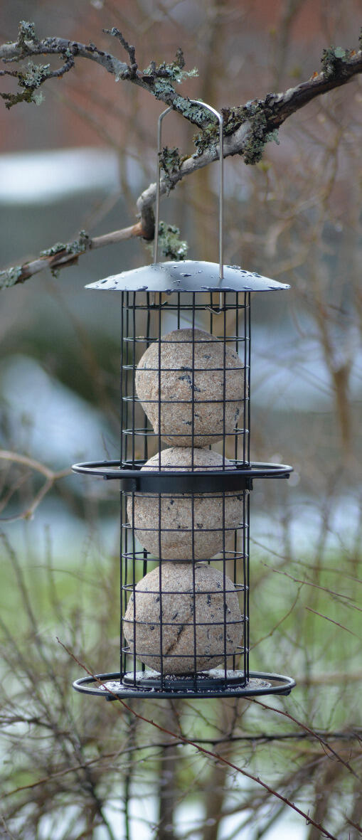 Tradisjonell fuglemater for både store og små meiseboller (480g og 90g). Av svart metall og med 2 metallringer der fuglene kan sitte. Bøyle for opphenging. H 35 cm, Ø 18 cm.