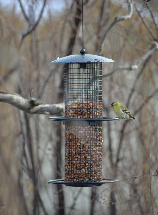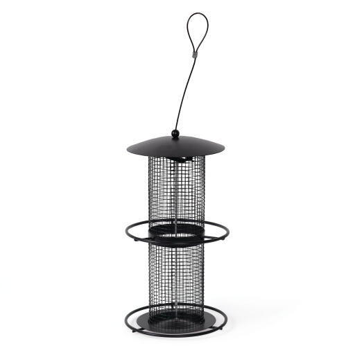 Tradisjonell fuglemater for nøtter. Av svart metall og med 2 metallringer der fuglene kan sitte. Vaier og karabinkrok inkludert. H 35 cm, Ø 18 cm.