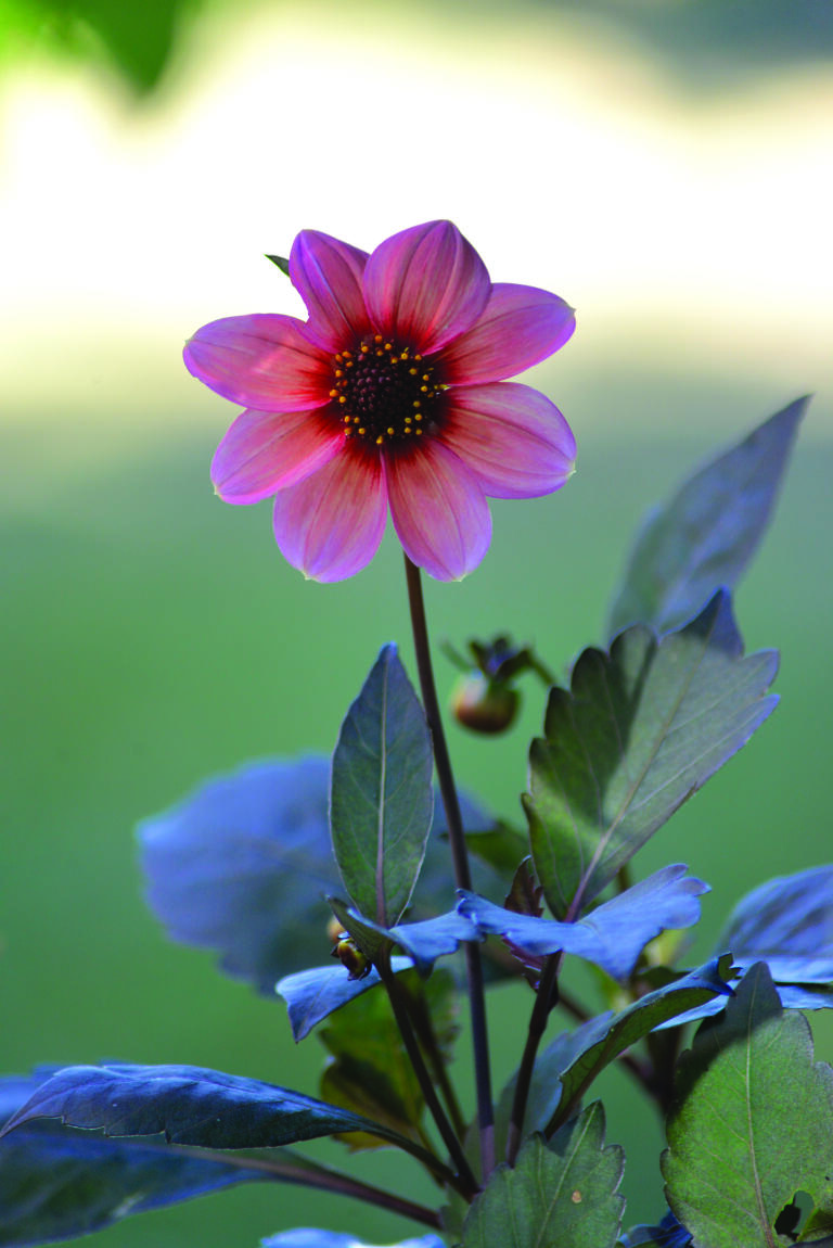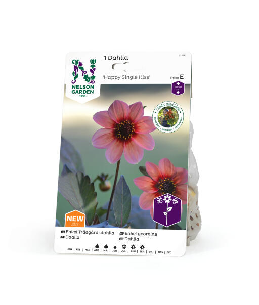 Trollbindende, nesten hypnotisk enkeltblomstret georgine med et mørkt midtparti og store, aprikosrosa kronblader. Blomsten kan bli ca. 9 cm og er vakker i både potte og bed.