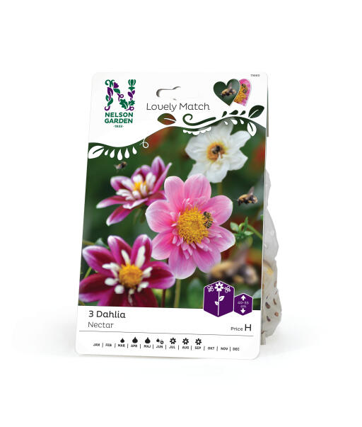 Tre søte georginer i rosa og hvitt med doble rader kronblad. De åpne blomstene lokker til seg bier, humler, og sommerfugler. Voksemåten er lav og kompakt, og de passer derfor både i potte og i bed. Med sine lange stilker er de også fine til snitt.