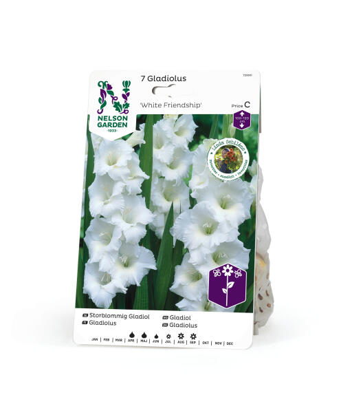 'White Friendship' er en storblomstret gladiol av høy kvalitet. Utmerket å bruke som snittblomst, og bør da høstes når den nederste blomsten har begynt å springe ut. Kan trenge oppbinding.
