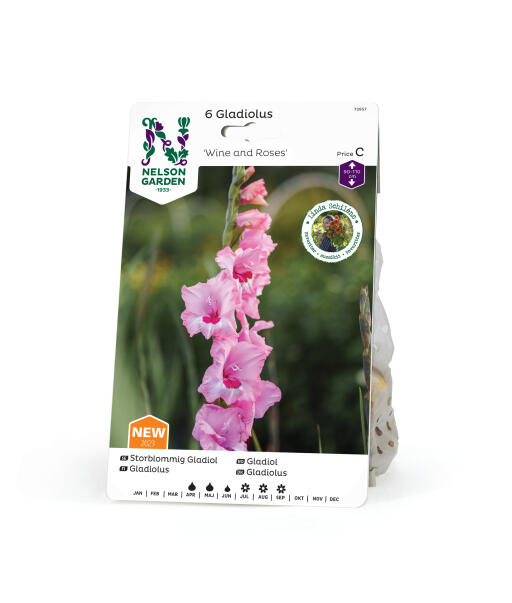 Trompetformede blomster i en herlig kontrast mellom den bringebærrøde midten og vakre, rosa blader. Stilkene på denne praktfulle gladiolen kan bli opptil 120 cm høye. Fin i både bed og bukett.
