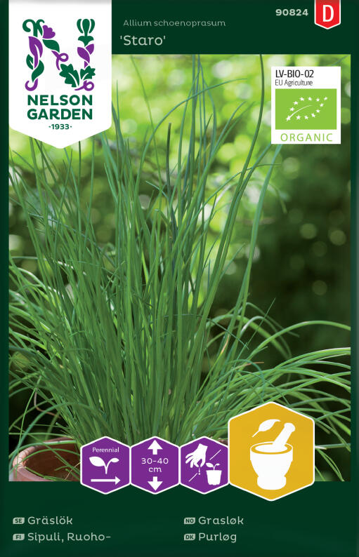 Økologiske frø. Denne sorten gir smale blad med fantastisk aroma og mild løksmak. Blomstrer med lilla, små blomster. Bladene høstes etter hvert. Blomstene kan også spises og er svært fine å dekorere med.