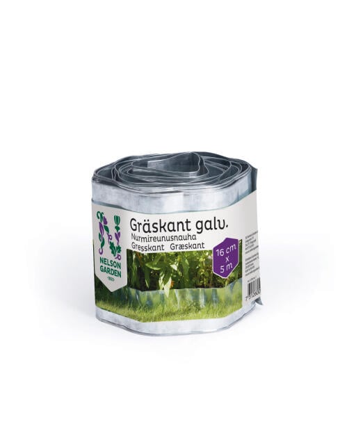 Galvanisert kantbeskyttelse. Praktisk å ha mellom bed og plen slik at gresset ikke sprer seg inn i bedet. Brukes til både rette og runde former.