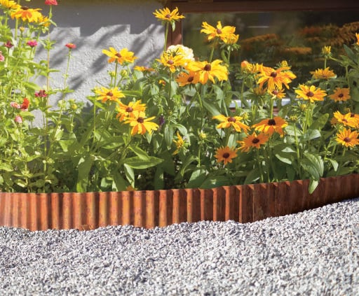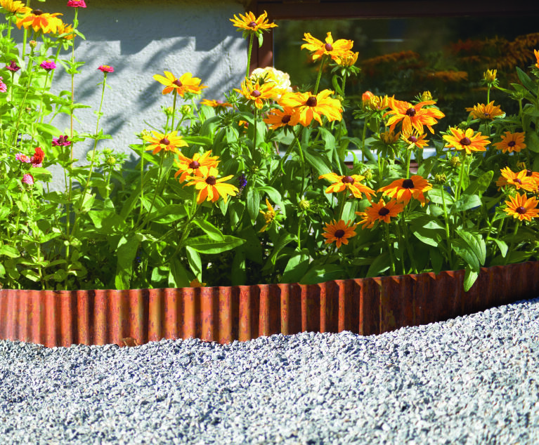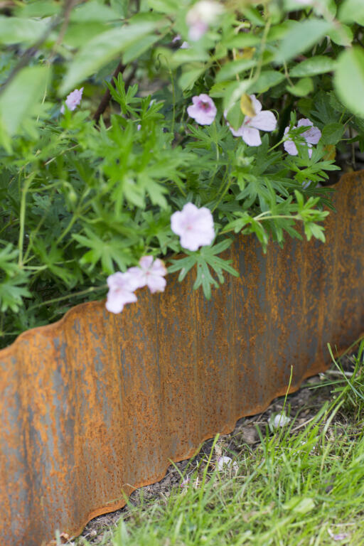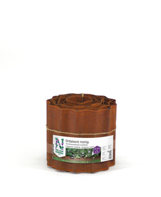 Rustaktig metallgresskant. Brukes mellom plen og bed slik at gresset ikke sprer seg inn i bedet. Behandlet for å ikke farge av. Til både rette og runde former.