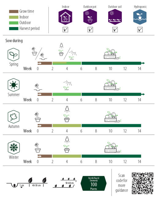 Mer detaljert informasjon om hvordan du sår, finnes her på produktsiden som du finner via QR-koden på posen.