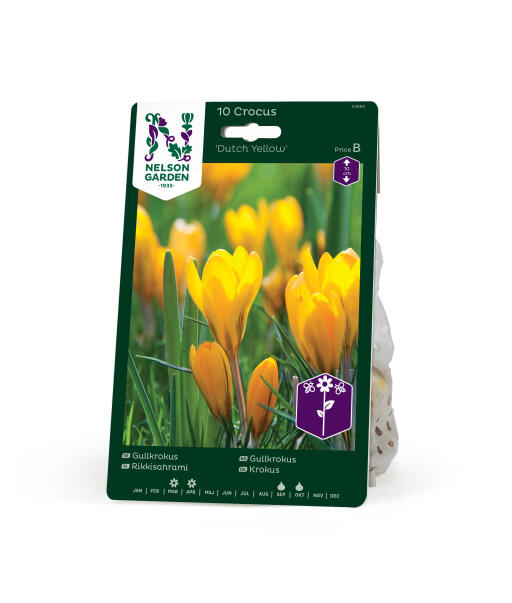 Gullkrokusen 'Dutch Yellow' har relativt store, herlig smørblomstgule blomster med smale fiolette striper på de ytre kronbladene. I tillegg til i bedet passer den fint i kanten av busker og hekker, og foran trær der vårsolen lyser.