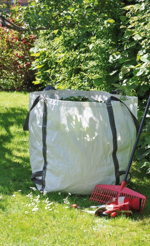 Hagesekk i kraftig materiale. Fire hanker ved bunnen gir et godt grep ved tømming. Hvit med svarte håndtak. Produsert i vevd polypropen. Maks: 200/400 kg.
