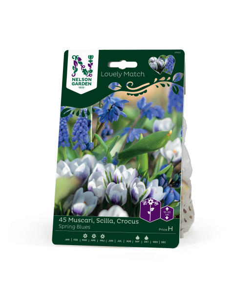 En stolt perleblomst, en krusete sibirblåstjerne, og en krokus med myke former. Det blir en virkelig søt vårbukett i blått og hvitt med innslag av fiolett. Passer til blomsterbedkant, korg og potte, og også i den første lille vasen om våren.