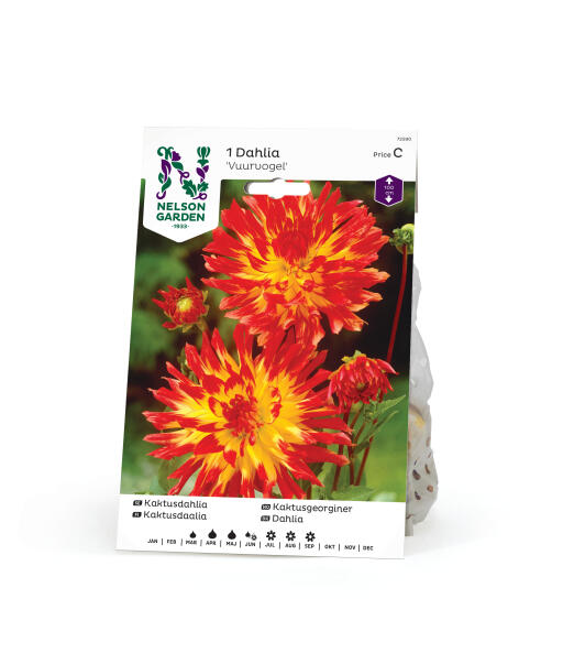 Oppsiktsvekkende og fargesprakende kaktusgeorgine med ildfullt oransjerøde blomster hele sommeren. Pryder sannelig sin plass i bed eller potte. Meget fin til snitt. Kan trenge oppbinding.