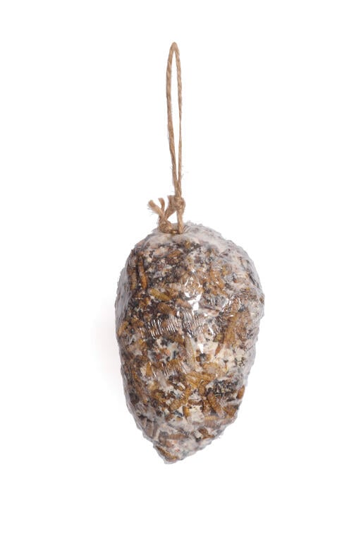 En dekorativ kongle fylt med talg, oljerike frø og mais samt proteinrike fluelarver fra svart soldatflue. En annerledes, men svært næringsrik rett på småfuglenes hagebuffet.