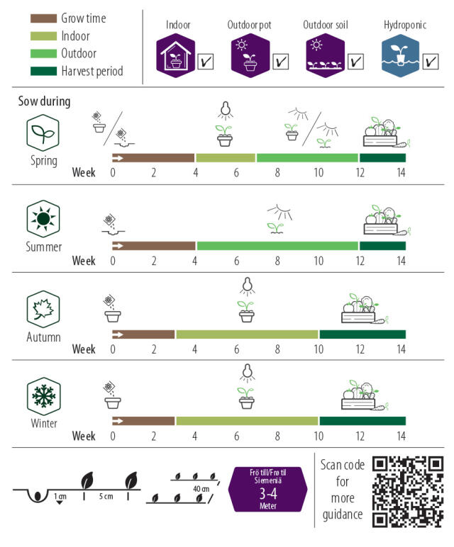 Mer detaljert informasjon om hvordan du sår, finnes her på produktsiden som du finner via QR-koden på posen.