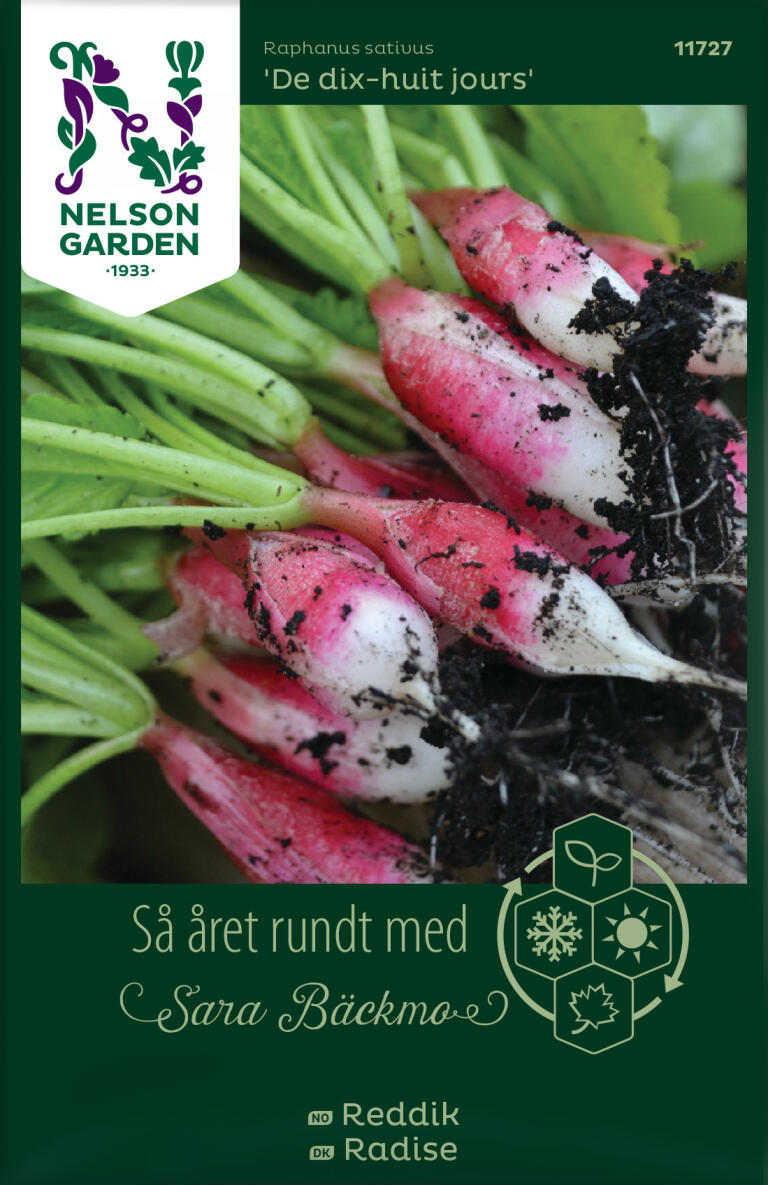 En superrask reddik, klar for høsting etter ca 18 dager. Reddiker trenger mye vann for å bli sprø og gode. De vokser aller best om våren og høsten, unngå dyrking om sommeren da de går lett i blomst. Så ofte for å høste over lang tid.