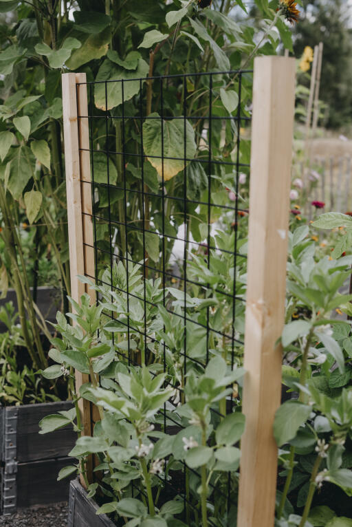 Svartlakkert metallespalier, egnet for klatreplanter i pallekarm. 71 x 110 cm