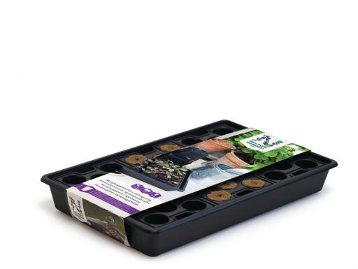 Spirekasse og minipluggbrett til jord eller planteplugger. Forenkler såing, forkultivering og omplanting. Kasse av gjenvunnet polypropen (PP), brett av polystren (PS). 14 planteplugger av komposterbar kokosfiber, torv og næring er inkludert. 23 x 37 cm