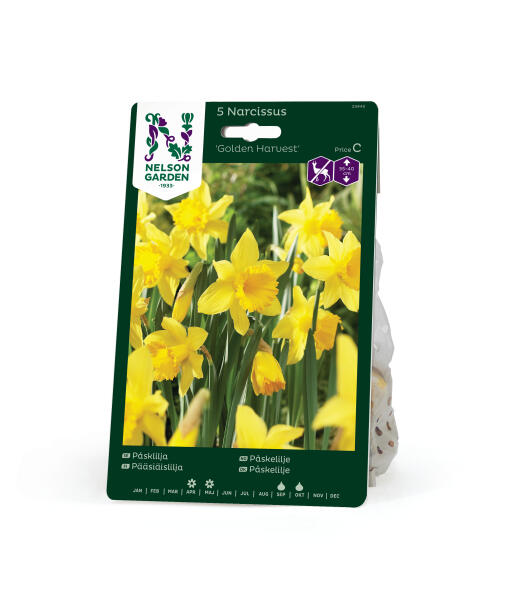 'Golden Harvest' er en påskelilje og tilhører Enkeltblomstgruppen. Den har store, vakkert gyldengule blomster og passer utmerket både i bedet, blant busker og under trær. Anses som mindre appetittlig for rådyr, hare, kanin og markmus.