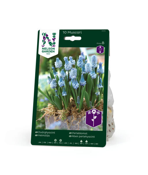 Denne lettdyrkede og duftende lille perlehyacinthen kommer gjerne igjen år etter år. De lyseblå blomstene har en gjennomsiktlig, hvit kant og beundres best på nært hold. Perfekt i potte og i kanten av blomsterbedet, og skjønn i små borddekorasjoner.