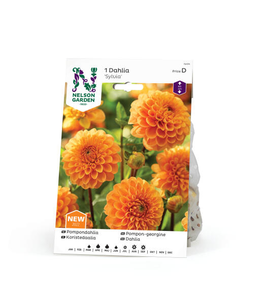 Høy, aprikosfarget pompon-georgine med mørke stilker, som er flotte som snittblomster. En sommerskjønnhet i bed og bukett.