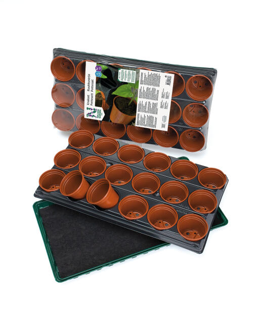 Enkelt omplantingssett bestående av bunntrau, vanningsmatte, og pottebrett med 18 potter (Ø 9 cm). Med jevn vanning fra undersiden utvikles plantenes røtter bedre. 56 x 31 cm.
