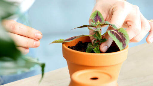 2. Ompotting av stiklinger: Fyll opp en potte med jord og plasser stiklingen like dypt som den stod tidligere, alternativt ca. 5–10 cm dypt eller på nivå med det første bladparet. Pakk jorden lett sammen rundt stilken og sørg så for å vanne. Træ gjerne en plastpose over potten for å lage et minidrivhus og plasser potten på et lyst sted.