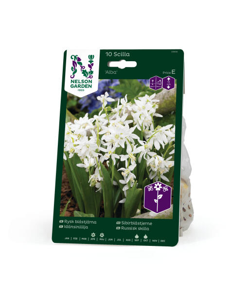 En meget søt, hvit sort sibirblåstjerne. Passer utmerket til forvilling under busker og trær. Fin sammen med vårblomster i andre farger, f.eks.perlehyasint.