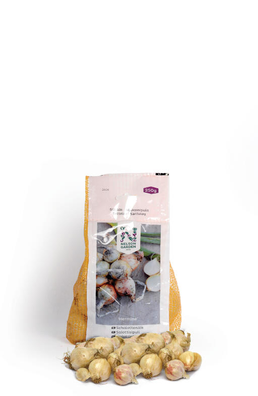 Setteløk. En unik hvit sjalottløk fra Frankrike. Meget smakfull. Så mild at den passer rå i salater, men er også god til å bakes i ovnen eller grilles. Hver løk som plantes deler seg til et knippe med ca. 5-8 nye løk.