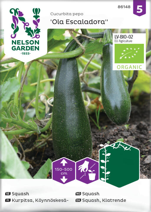 Økologiske frø. En klatrende squashplante som gir stor avling av grønne, ca 20 cm lange frukter. Høst jevnlig. Trenger støtte. Sideskuddene kan toppes.