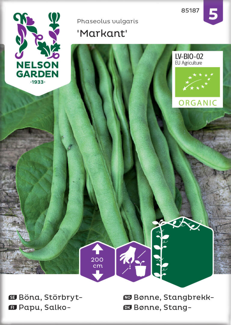 Økologiske frø.En fin sort som gir rikelig avling av lange, helt trådfrie belger. Plantes f.eks. ved en espaljé på et lunt sted. Høstes etter hvert. Kokes og spises, kan med fordel fryses.