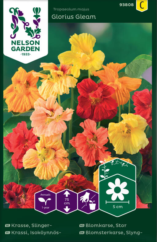 Blomkarse med fylte blomster i gult, oransje og rødt. Dyrkes gjerne i ampel, mot espalier eller som markdekker. Blomstene er spiselige. Bløtlegg frøene før såing, da spirer de bedre.
