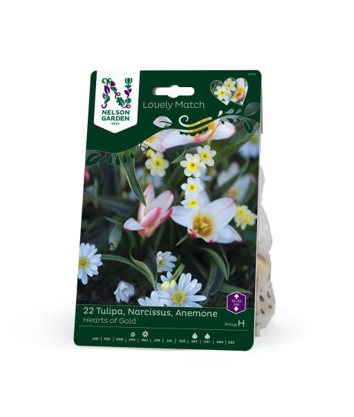 En søt miks av tulipan, narsiss og balkansymre for blomsterbed, potte eller kurv. Blomstenes ulike høyder, farger og former løfter og fremhever hverandre og felles for alle er deres gule midtre som åpner seg mot solen.