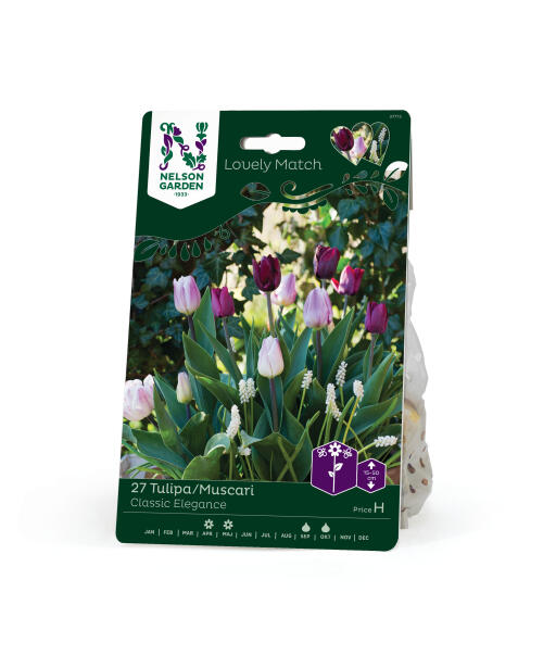 En balansert fargekombinasjon fra dempet vinrødt, via lillarosa toner til hviteste hvitt. Tulipanens klassiske form markeres flott av perlehyasintens drueklaser av kritthvite blomster. En stilren kombinasjon for blomsterbed eller potte.