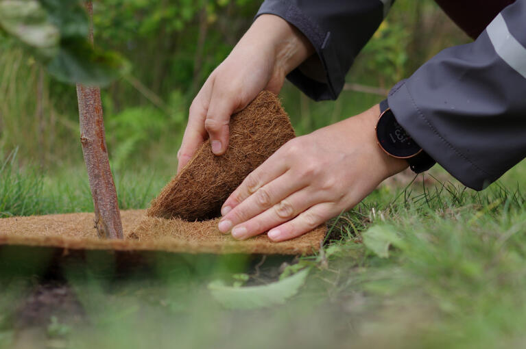 Rund matte av kokosfiber som hindrer ugress og bevarer fuktigheten i jorden. Snittet inn mot midten gjør den enkel å legge rundt trær eller busker. Kan eventuelt dekkes med bark.