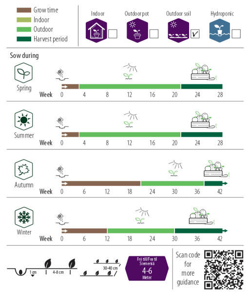 Mer detaljert informasjon om hvordan du sår, finnes her på produktsiden som du finner via QR-koden på posen.